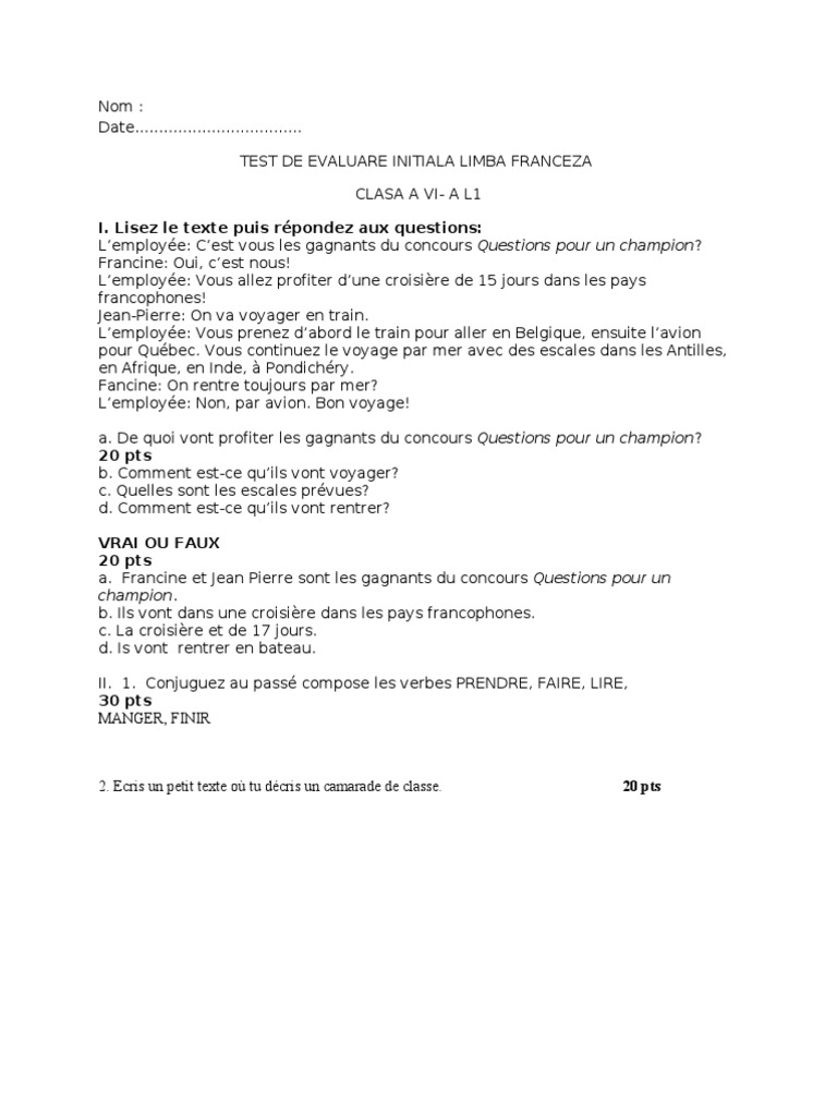 0 Test De Evaluare Initiala Franceza Cls V Transport Echecs